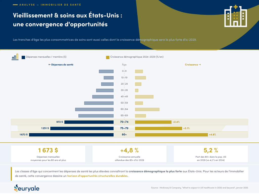 Les données présentées dans cette infographie mettent en évidence une dynamique structurante du système de santé américain : les classes d’âge qui concentrent aujourd’hui les dépenses de santé les plus élevées sont également celles dont la croissance démographique sera la plus soutenue à l’horizon 2029. En particulier, les populations les plus âgées notamment les 75 ans et plus cumulent à la fois un niveau de dépense mensuelle par individu significativement supérieur et des perspectives d’augmentation rapide de leur poids dans la population.