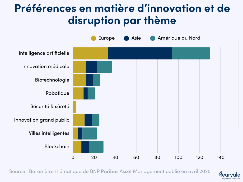 Malgré des écarts régionaux, la thématique “Innovation santé” est citée par 14 % des investisseurs nord-américains, 12 % des Européens et 11 % des Asiatiques – soit des niveaux proches, qui traduisent une reconnaissance globale de la transformation en cours dans le secteur de la santé. Biotechnologie, technologies médicales, robotisation des soins ou encore personnalisation des traitements : les leviers d’innovation sont multiples et touchent l’ensemble de la chaîne de valeur.