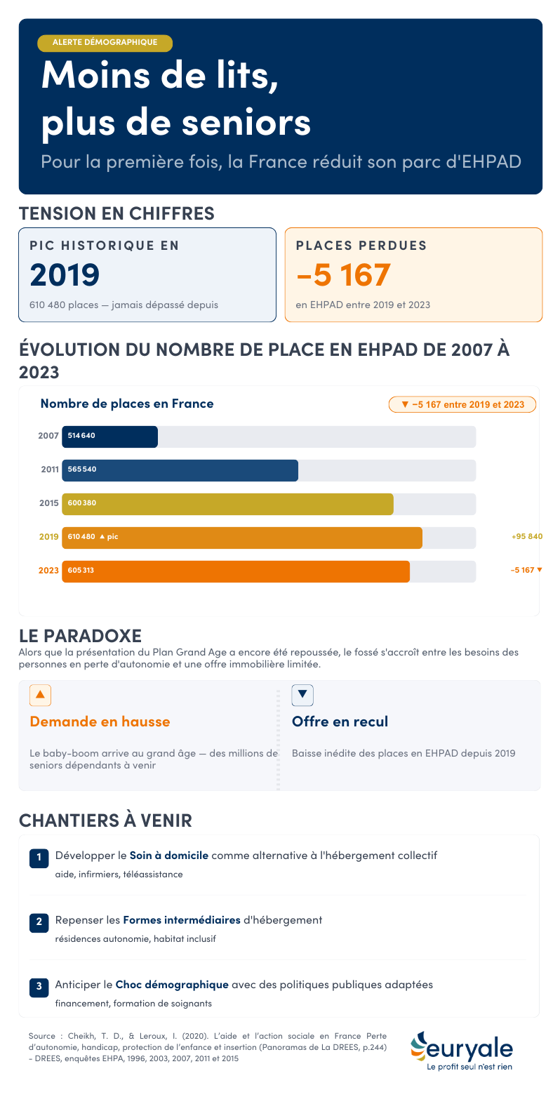 Pour la première fois, le nombre de places en EHPAD en France enregistre un recul, avec une diminution de 5 167 places entre 2019 et 2023, après un point haut atteint en 2019 à 610 480 places. Cette évolution marque une inflexion notable dans la dynamique de l’offre, qui tend désormais à stagner, voire à se contracter, alors même que les besoins liés au vieillissement de la population continuent de croître.