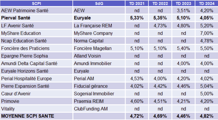 Le rendement dépend de chaque SCPI, de sa stratégie et du marché. Il n’est ni garanti ni stable dans le temps. En 2024, le Taux de Distribution moyen des SCPI de santé est de 4% (source ASPIM-IEIF).